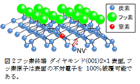 【研究の背景・目的】 ダイヤモンド中の窒素と空孔により形成されるNVセンターの電子スピンと、他の電子スピンや核スピンとの相互作用の応用として、量子コンピューター用キュービット、表面吸着分子の局所核磁気共鳴(NMR)検出等の研究が世界的に非常に盛んである。図1に示すように、負に帯電したNVセンター(NV-)の2個の電子スピン(S=1)が、磁場なしで2準位(MS=0とMS=±1)に分裂し、室温でスピン偏極し、マイクロ波(2.88GHz)でスピン共鳴吸収する。NV-の電子スピンのMS=0とMS=-1の重ね合わせが、スピン共鳴と単一光子源としてのNV-の赤色蛍光(638nm)により、高感度検出できる。このMS=0とMS=-1の重ね合わせのエンタングルメント状態で、単一核スピンが検出される。既にダイヤモンド中の13C(論文1)や表面上のオイルやPMMAの1HのNMR観測がドイツ、米国から報告され、緊急性が高いテーマである。しかし、まだ感度、安定性が低く、これを克服し、単一NV-センターによる生体分子の局所NMR観測を本研究で行う。