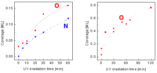 図1 各種ダイヤモンド基板に対するXPS結果 次に、 XPS の結果から定量化を行いました。 UV 照射時間と吸着原子の被覆率との関係を図 2 に示します。図 2 より、酸素、窒素の被覆率ともに UV 照射時間の増加に伴って増加していることが分かります。このように、ダイヤモンド表面は UV 照射のみで簡単に表面改質することが可能です。これらの表面を利用すれば、性質の異なる FET を作製することが可能となります。