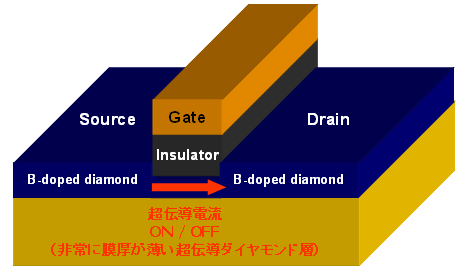 図: 膜厚が非常に薄い超伝導ダイヤモンドを利用したスイッチングデバイス概念図 発表論文 H. Umezawa, T. Takenouchi, Y. Takano, K. Kobayashi, M. Nagao, I. Sakaguchi, T. Hatano, G. Zhong, M. Tachiki, H. Kawarada, cond-mat/0503303 発表学会 北郷 伸弥, 栗原 槙一郎, 渡邉 恵, 野村亮, 鹿又 龍介, 高野 義彦, 山口 尚秀,川原田 洋 "Tc(offset)>10Kの高濃度ボロンドープダイヤモンド(111)薄膜における超伝導特性", 日本物理学会2010年秋季大会, 大阪府立大学, 2010年9月 野村 亮,北郷 伸弥,渡辺 恵,鹿又 龍介, 栗原 慎一郎, 高野 義彦,山口 尚秀,川原田 洋 "ダイヤモンド超伝導体によるNISトンネル接合の特性評価", 2010年秋季物理学会,大阪府立大学,2010年9月 栗原 槙一郎, 野村亮, 鹿又 龍介, 坪井 秀俊, 宇都宮 大起, 山口 尚秀, 高野 義彦, 川原田 洋 "超伝導ボロンドープダイヤモンド薄膜の異方性評価", 日本物理学会2011年秋季大会, 富山大学, 2011年9月 鹿又 龍介, 宇都宮 大起, 野村 亮, 栗原 槙一郎, 坪井 秀俊, 山口 尚秀, 高野 義彦, 川原田 洋 "超伝導ボロンドープダイヤモンド積層構造による接合の特性評価", 日本物理学会2011年秋季大会, 富山大学, 2011年9月 S. Kurihara, S. Kitagoh, M. Watanabe, R. Nomura, R . Kanomata, Y. Takano, T. Yamaguchi, H. Kawarada, “The properties of superconducting heavily boron doped diamond (111) film with Tc above 10K”5th International Conference on New Diamond and Nano Carbons,Matsue,Japan,May 2011 R. Kanomata, M. Watanabe, S. Kitagoh, R. Nomura, S . Kurihara, Y. Takano, T. Yamaguchi, H. Kawarada “Characteristic evaluation of SNS junction by Boron-doped diamond”5th International Conference on New Diamond and Nano Carbons,Matsue,Japan,May 2011 |