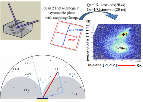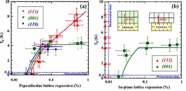 はじめに~超伝導とは~ 超伝導とは、ある特定の物質を低温に冷却すると、ある温度で電気抵抗がゼロになる現象です。また超伝導を示す物質のことを“超伝導体”、超伝導体が超伝導状態を示す温度を“超伝導転移温度Tc”と呼びます。超伝導体は、ゼロ抵抗以外にも超伝導体内部から磁場が排除される“マイスナー効果”といった特徴が挙げられます。これら超伝導体のユニークな特徴を利用して、超伝導磁石を利用したリニアモーターカーや医療用MRI、超高感度の磁気測定装置SQUIDなどに応用され、現代社会には必要不可欠なテクノロジーになりつつあります。1911年に、カメルリング・オネスが、約4.2K (摂氏-269度) で、水銀の超伝導現象の観察に成功して以来、超伝導体の探索はさかんに行われ、1980年代には銅酸化物高温超電導体(Tc=30K ~ 160K)、2001年には、MgB2(Tc=39K)が発見されました。 ダイヤモンド超伝導の夜明け 2004年、E.A. Ekimovらが、高圧固相拡散法という合成手法によりボロンドープダイヤモンド(ボロン=ホウ素)がTc=約2Kで超伝導状態となることを発見しました。その同2004年に我々は、化学気相堆積(CVD)法による世界初の超伝導ダイヤモンドの作製に成功しました。CVD 法は高純度かつ薄膜状の試料が合成可能であり、これにより様々な物性評価が可能となりました。これまでの研究の中で、転移温度Tc(offset)>10Kの世界で最もTcが高い試料の合成に成功しています。10K という値は超伝導転移を示す半導体材料の中でも最高の温度であり、超伝導応用が充分に期待できる温度になります。そこで我々は、ジョセフソン接合を用いたSNS接合デバイスの作製も行ってきました。 超伝導ダイヤモンドのX線回折法による評価 ダイヤモンド中のボロン濃度が高くなるほど超伝導転移温度が上昇することは明らかになっていましたが、ダイヤモンド中にどの様にボロンが入り、結晶性が変化しているかは明らかになっていませんでした。C-C結合と比べてC-B結合距離は長く、そのため結晶はC-B結合が支配的な方向へ伸張します。そこで、X線回折法による逆格子マッピング測定による評価が重要となります。図1は、逆格子マッピングの模式図になります。この例では、(111)面を上としたときに、面垂直および水平方向への格子伸張を測定するため、(113)面による非対称逆格子マッッピングをとっています。図2(a)は、面方位による格子伸張の依存性を測定したものです。他の面方位と比べて、(111)面は垂直方向への格子伸張率が大きく、またそれに従ってTc も大きくなる傾向がみられます。図2(b)は、面方位による結晶成長の違いを、垂直、水平方向の伸張率から考察したものです。(111)は、結晶が縦方向のみに伸張する歪み層を形成しています。一方、(100)は結晶が縦方向と横方向の両方に伸張している緩和層を形成しています。これまでの研究により、(111)の様な縦方向のみへ伸張する歪み層が、高いTcを出すためには望ましいことがわかってきています。