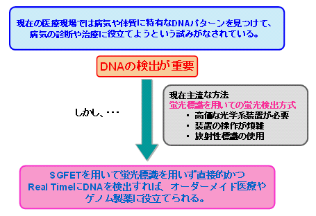 めざましい医療技術の進歩に伴い、オーダーメイド医療やゲノム製薬といった、一昔前までは到底実現することができないと思われた医療技術が、ここ数年のうちに実現する可能性が出てきています。こうした医療を実現させるために、タンパク質やDNAの持つ重要な情報を高感度に検出する技術の開発が求められています。 |