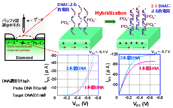 | DNAはリン酸基による負電荷を持っていますが、ハイブリダイゼーション (互いに相補的な1本鎖DNA同士が結合して2本鎖になる現象) を行うことによりその負電荷は約2倍になります。SGFETのチャネル表面にDNAを固定することで、この現象を検出することが可能です。下図のように、ハイブリダイゼーションによりチャネル表面に励起されるホールの数が増加し、ドレイン電流が増加します。さらに、我々はDNAのリアルタイム検出にも成功しており、ダイヤモンドの持つ生体適合性を利用して臨床応用が実現可能なデバイスとして期待されます。 | ||