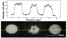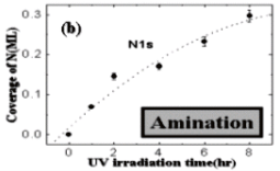 我々はこれまでに水素終端表面伝導性を用いた電解質溶液ダイヤモンドFET(SGFET)を作製している。また、部分的にアミノ化したSGFETにグルタルアルデヒドをリンカーとしてDNAを固定したDNAセンサも試作している。今回、新しい微細パターン方法を適用し、ダイヤモンド表面にジカルボン酸化合物(CAC)をリンカーとしてプローブDNAを固定し、ターゲットDNAとして相補的DNAと非相補的DNA を利用して、ハイブリダイゼーションの効率と選択性を評価した(Fig1)。まず、アンモニアガス中でUV照射を行なうことによりプローブDNAを固定できるアミノ基が生成される。照射時間によってアミノ基の密度を調節できることから、プローブDNA の密度を調節することも可能である。今回は4.3%のアミノ化表面でハイブリダイゼーション効率を評価したところ、プローブDNA密度が低い場合はリンカーの柔軟性より結合部位の密度が重要なパラメータになる事を確認した(Fig. 2, 3)。