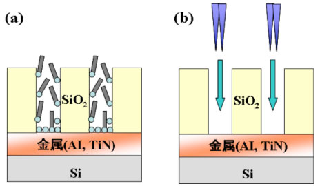 化学気相合成(CVD)法を用いて, カーボンナノチューブ(CNT)を合成する場合, CNTは触媒微粒子に成長するという特徴を持ちます。CNTの配線応用では, ビアホール(穴)の底からCNTを垂直方向にボトムアップ成長することでLSI多層配線の下層と上層を縦方向に架橋する構造を目標としています。そのため, 配線応用で最も重要となるのはナノサイズのビアホール底への触媒微粒子形成技術になります。通常, 触媒はスパッタリングや電子線蒸着により形成することができますが、この方法ではビアホール底へ精度良く触媒を蒸着することは困難になります。図1(a)はスパッタによるビアへの触媒形成を示していますが, ビアの直径が小さくなると触媒がビアの側面にも蒸着されてしまい, 配向CNTが得られないという問題が生じます。この問題を解決するには, より指向性の高い触媒形成技術が必要となり, 最適な方法としてイオン注入法が考えられます。図1(b)はイオン注入によるビアへの触媒形成を示しています。我々はイオン注入法として, 収束イオンビーム(FIB; Focused Ion Beam)装置を使用しました。FIBは次のようにしてイオンビームを照射します。液体金属イオン源(LMIS:Liquid Metal Ion Source)に電圧をかけてイオンを引き出し, 最初のレンズで1段階目のビームの収束を行います。LMISは, イオン源の融点を下げるため, 通常はイオン化したい元素と他の元素との合金を用います。その中から所望のイオンのみを取り出すために, E×B質量分離器により電界Eと磁界Bをビームに印加し, 質量による分離を行います。さらに, イオンビームを, 設定された大きさの径の穴に通すことで出力を制御し, 2つめのレンズで2段階目のビームの集束を行う。これによりビームの径が数十nmに集束されてステージ台にある試料に照射されます。イオン注入は高真空プロセスであるために指向性が高く, 打ち込み精度も良いので正確に触媒量を決めることができます。さらにFIBによるイオン注入はLSI配線の切断・接続といった加工に使われており, LSIプロセスに適応した技術として既に確立されているため, この方法はCNTをLSIのトランジスタや配線に応用する上で非常に有益なものになります。 |