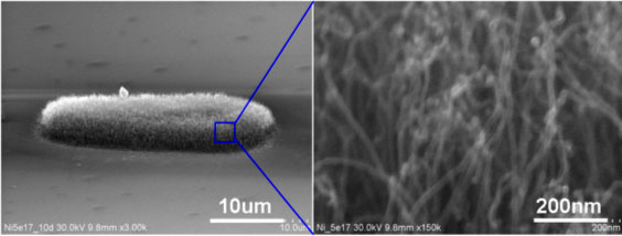 我々は, イオン源としてニッケルを使用し, 絶縁膜(SiO2)上にイオン注入によって触媒微粒子を形成し, CNTを成長させることに成功しています(図2)。今後は, 配線応用に向けて実際にビア構造を作成し, イオン注入を用いてビアホールの底の金属上に触媒を形成し, CNTを成長させることを目指します。 |