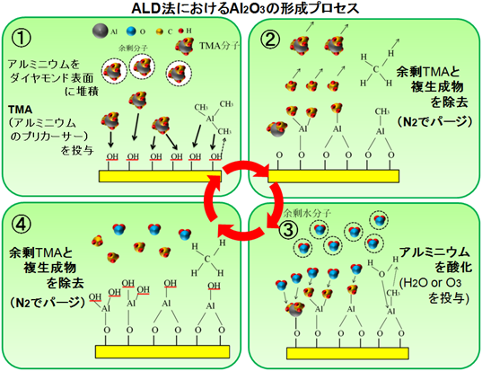 川原田研究室では、大電力制御を目指したパワー半導体デバイスの心臓部であるゲート絶縁膜として、酸化アルミニウム(Al2O3)を専門に研究する班を設けています。半導体デバイスでは、絶縁膜に電圧を加えることで電流を制御しており、パワー半導体デバイスは、より高い電圧を絶縁膜に加えるため、絶縁膜の性能が極めて重要になります。また、ダイヤモンドデバイスは高温環境での利用が期待されているため、用いられる絶縁膜は、絶縁耐圧などの電気特性だけでなく、耐熱性にも優れている必要があります。Al2O3は優れた電気的絶縁性を持つため、ダイヤモンドデバイスの絶縁膜として有望です。私たちは、原子層堆積(Atomic Layer Deposition;ALD)法を用いて高温雰囲気にて成膜することにより、耐熱性に優れたAl2O3の形成に成功しました。下図は、ALD法の成膜過程を表しており、①→②→③→④→①を繰り返すことで、原子レベルで成膜を制御でき、絶縁膜に適した平坦なAl2O3の形成が可能になります。